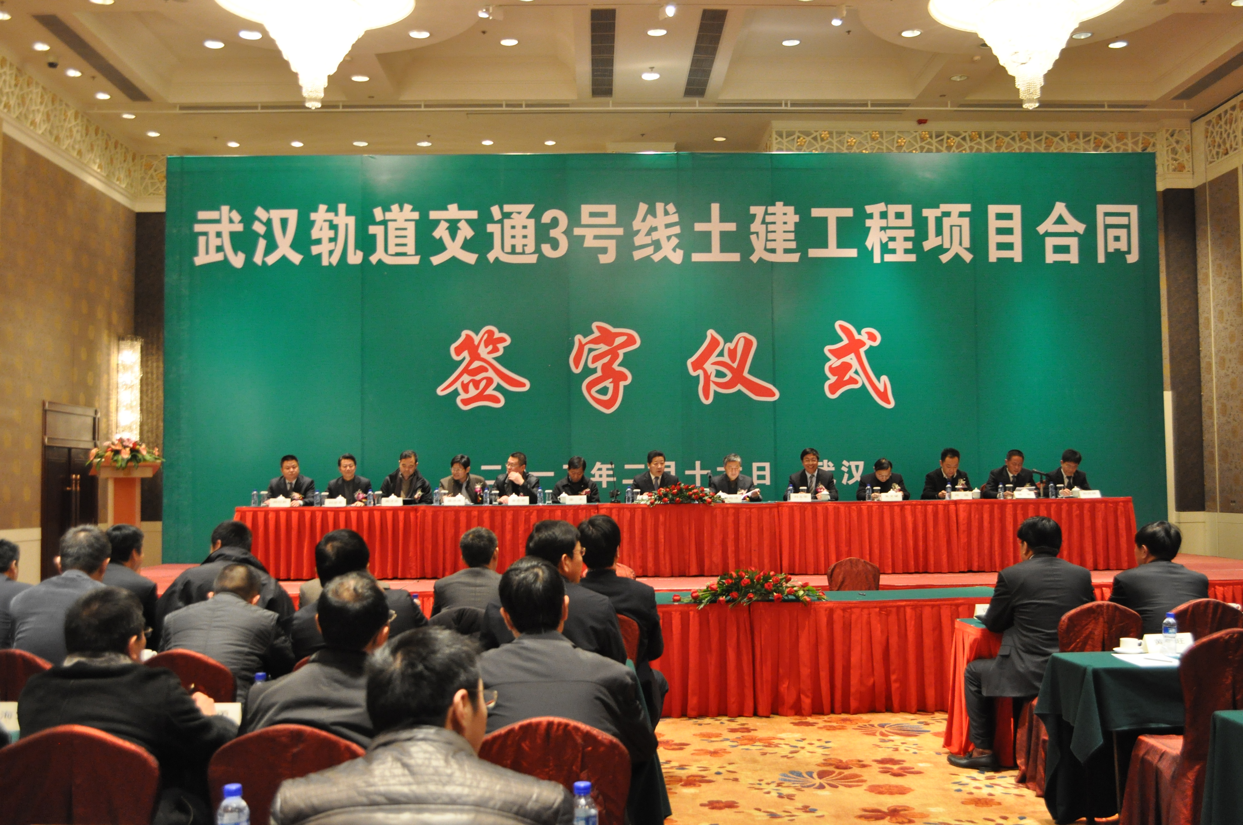 2012年2月16日下午,連通三金潭到沌陽(yáng)大道的武漢軌道交通3號(hào)線一期土建工程項(xiàng)目合同簽字儀式在武漢香格里拉大酒店隆重舉行,標(biāo)志著武漢地鐵又一條線路進(jìn)入實(shí)質(zhì)性建設(shè)階段。武漢地鐵集團(tuán)總經(jīng)理劉玉華與14家中標(biāo)單位代表簽訂施工合同,武漢市發(fā)改委副主任熊貽沛、市相關(guān)部門領(lǐng)導(dǎo)、地鐵集團(tuán)董事長(zhǎng)涂和平及其主要領(lǐng)導(dǎo)出席簽約儀式。