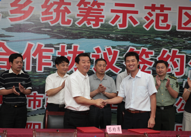 7月20日,鐘鑫公司董事長王智高與黃金口工業(yè)園區(qū)建設(shè)發(fā)展有限公司董事長唐群雁正式簽訂合作協(xié)議,成立武漢市漢陽區(qū)城鄉(xiāng)統(tǒng)籌示范區(qū)建設(shè)開發(fā)有限公司,共同統(tǒng)籌漢陽區(qū)“七村一場”城鄉(xiāng)綜合改造,區(qū)委書記曹裕江、區(qū)相關(guān)部門領(lǐng)導(dǎo)、漢陽市政領(lǐng)導(dǎo)胡紅勝、曾凡龍出席簽約儀式。