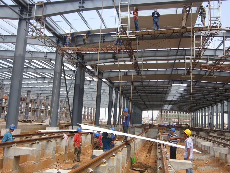 為確保施工節(jié)點工期,順利完成工程收尾攻堅階段,公司堅持緊密圍繞施工的各項指標,以“搶工期、保安全、保質量、控造價”為目標,從嚴管理,強力推進,不遺余力的搶工期抓進度。目前的工程重點是運用鋼結構、土建工程以及三個門衛(wèi)房,至今形象進度鋼結構的鋼柱鋼梁已全部完成,檁條安裝完成80%,屋面安裝完成了40%。由于天氣炎熱,鋼構件的溫度可謂是“燙手”,大大增加了白天安裝的難度;運用庫道床基礎基本完成,目前正在進行附屬用房的砌體工程,與幾方的交叉作業(yè)是其施工難點;門衛(wèi)房是常規(guī)的鋼筋混凝土結構,但門衛(wèi)房一的一層含分部夾層,建筑高度為11.4m,建筑面積為313.26㎡;門衛(wèi)房二、門衛(wèi)三(一層)建筑高度為4.3m,建筑面積為48.64㎡,都屬于異形結構,施工難度系數(shù)較高。另外還有邊坡防護、圍墻等分部工程同時進行。