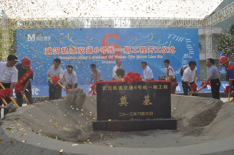 2013年8月6日,銜接漢口、漢陽(yáng)的重要客運(yùn)交通走廊、武漢市在建最長(zhǎng)的軌道交通線路——軌道交通6號(hào)線一期工程隆重舉行開工儀式。圖為市委書記阮成發(fā),市長(zhǎng)唐良智,與市民代表、設(shè)計(jì)、施工、監(jiān)理單位代表一起,為工程開工培土。