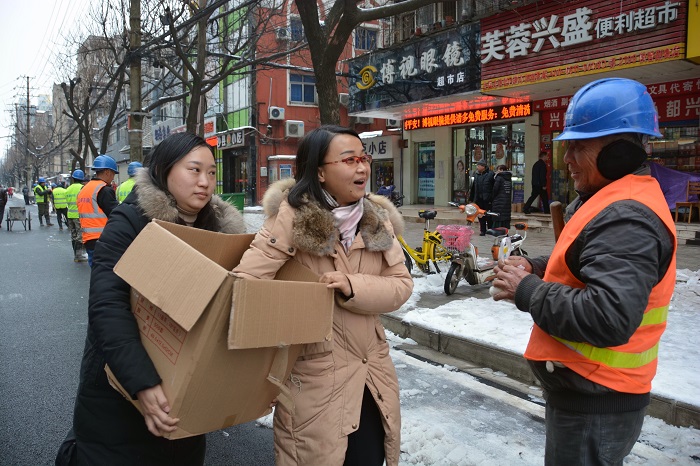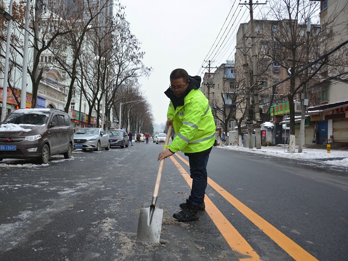 指針來到下午14時,鐘鑫市政“鐵軍”在公司領導的帶領下,搶險隊伍馬不停蹄地來到了國博大道??碧酵戡F(xiàn)場之后立即做出工作部署,將全體人員和機械按照路段劃分為三個路段進行除雪破冰。下午的國博大道,寒風凜冽,氣溫格外寒冷。好在鐘鑫公司的女同志們不顧嚴寒,精心準備了充足的姜湯和熱騰騰的包子,為饑寒交迫的搶險隊伍送來了熱飲和食物,姜湯驅除寒氣,食物更暖人心,隊伍在下午18時順利完成了清掃任務。期間,方紫微帶領部分人員火速馳援馬滄湖路進行路面清掃,擼起袖子和大家伙兒一起干!清掃完畢的馬滄湖路煥然一新。