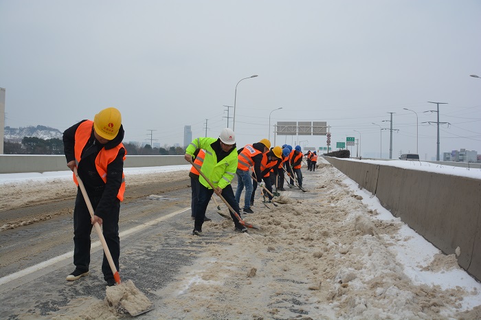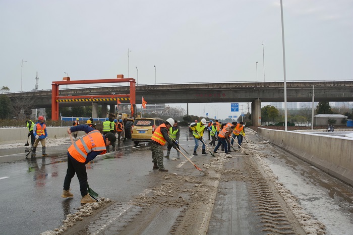時間來到28日上午8時,在三環(huán)線百威路—長豐橋路段,鐘鑫公司迅速調度六大項目部150人和鏟車、農(nóng)用車數(shù)臺,集體前往三環(huán)線高架進行除雪破冰。8點鐘的三環(huán)線高架,格外清冷,最低溫度甚至達到了零下6度!可是當你置身于搶險現(xiàn)場時,卻完全感覺不到寒意——只因為大家全身心的投入到搶險工作中,一把把鐵鍬揮舞得那么有力,一條條產(chǎn)雪破冰后的路面是那么干凈整潔,現(xiàn)場氣氛是那么的熱烈。期間更是迎來了漢陽區(qū)委書記馬澤江、漢陽市政集團公司董事長嚴悌文等領導來到搶險現(xiàn)場指揮工作,為正在搶險的“鐵軍”們鼓勁加油,大家干勁更足了,精神更振奮,最終在下午13:30將三環(huán)線百威路—長豐橋路段路面積雪清掃完畢。