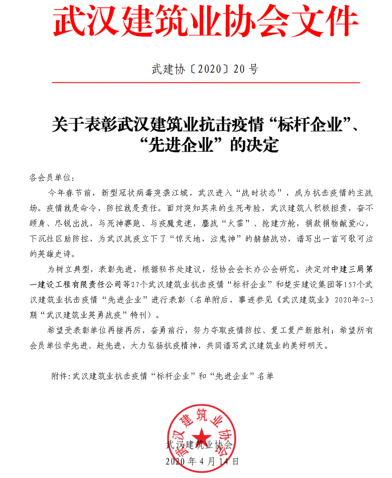 近日,武漢建筑業(yè)協(xié)會(huì)發(fā)布《武建協(xié)20號(hào)——關(guān)于表彰武漢建筑業(yè)抗擊疫情“標(biāo)桿企業(yè)”、“先進(jìn)企業(yè)”的決定》,對(duì)在抗疫“主戰(zhàn)場(chǎng)”積極擔(dān)責(zé),奮不顧身、精銳出戰(zhàn),與死神賽跑、與疫魔競(jìng)速的27家武漢建筑業(yè)“標(biāo)桿企業(yè)”、157家“先進(jìn)企業(yè)”進(jìn)行表彰。漢陽(yáng)市政鐘鑫市政公司在抗疫過(guò)程中主動(dòng)作為、勇于擔(dān)當(dāng),獲評(píng)“先進(jìn)企業(yè)”榮耀稱(chēng)號(hào)。