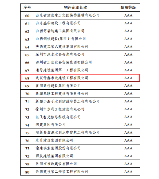 近日,中國(guó)施工企業(yè)管理協(xié)會(huì)發(fā)布了《關(guān)于公布2021年度第一批工程建設(shè)企業(yè)信用評(píng)價(jià)結(jié)果的通知》,鐘鑫公司首次獲評(píng)中施企協(xié)AAA信用等級(jí)企業(yè)!被評(píng)定為“經(jīng)營(yíng)狀況很好,信用記錄優(yōu)秀,發(fā)展前景很廣闊,對(duì)履行相關(guān)經(jīng)濟(jì)和社會(huì)責(zé)任能夠提供很強(qiáng)的安全保障,不確定因素對(duì)其經(jīng)營(yíng)和發(fā)展的影響最小”的企業(yè)。